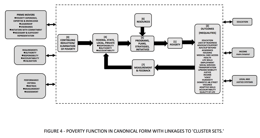Definition: The core function of Figure 4 is that of Figure 2; however, the dynamics [behavior] of this core function are extrinsically linked to a set of activities outside of the core function. These outside activities are education, income & employment, prime movers, requirements, legal and justice systems and performance criteria. These six outside activities [aka 'clusters'] serve to expand the arena of poverty and its intrinsic dynamics. Additionally, these 'clusters', individually and collectively, directly and indirectly shape the outcomes [2] of poverty.